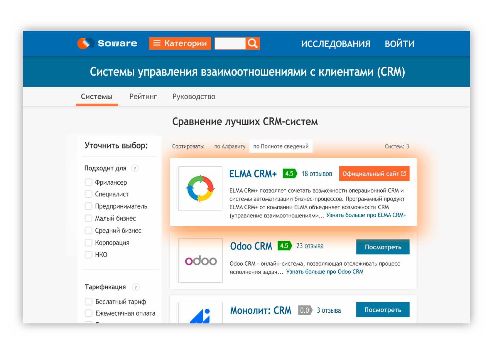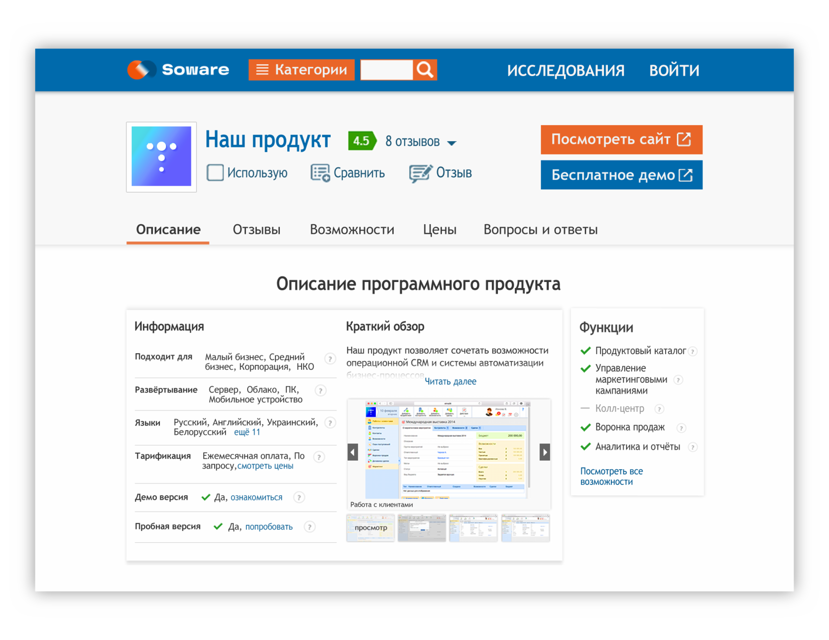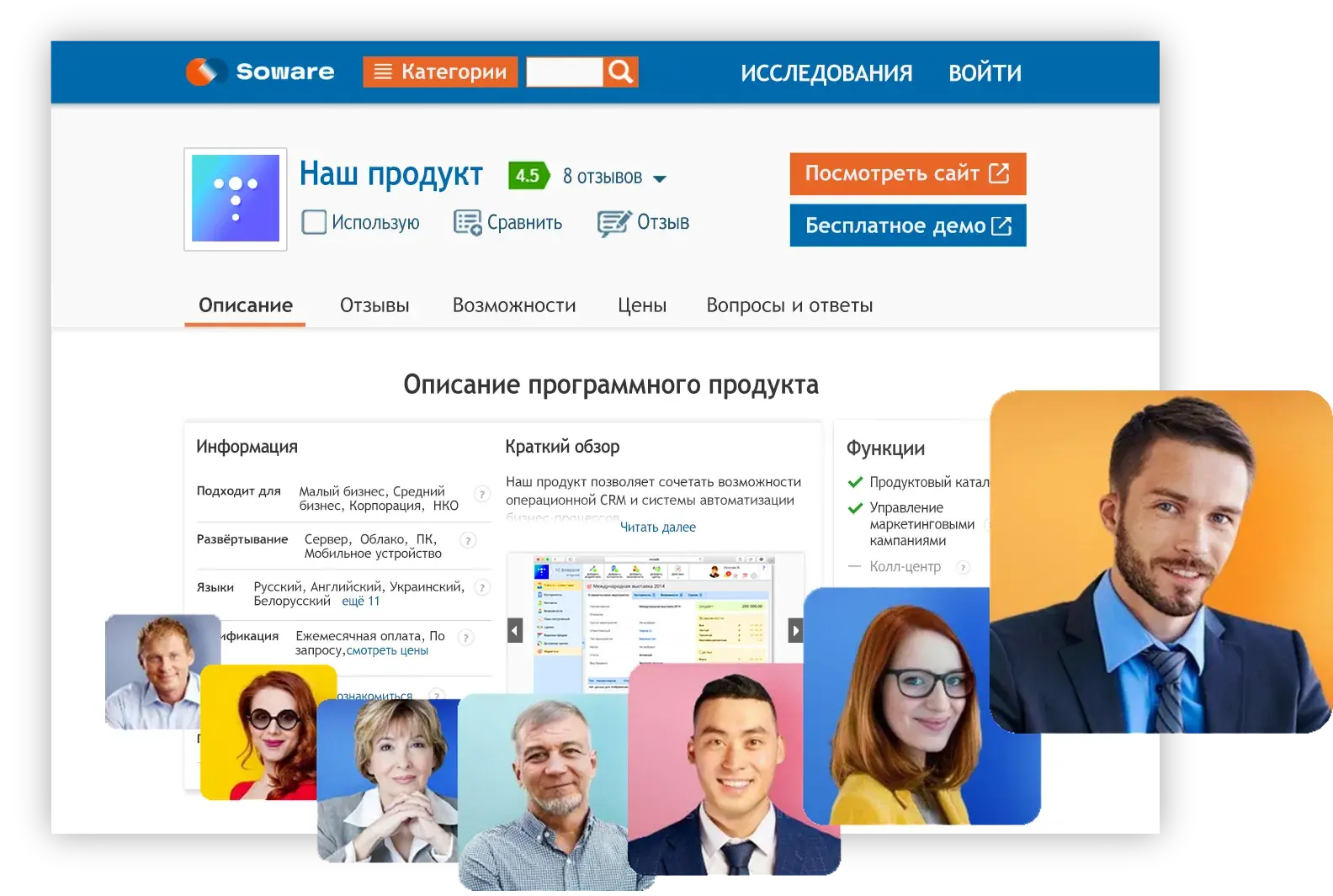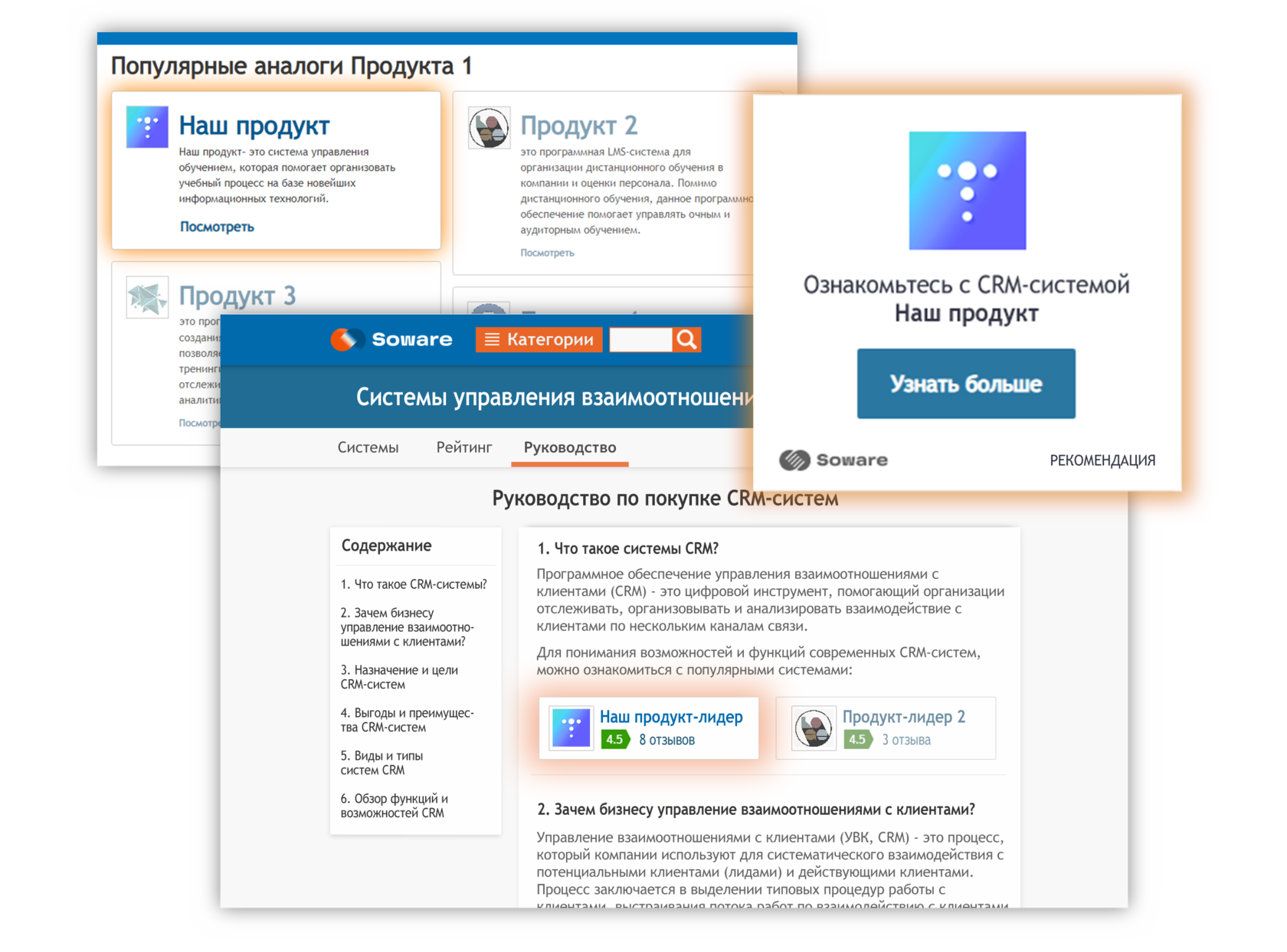 Являясь Лидером рынка, будьте на виду у потенциальных покупателей на всех релевантных информационных страницах благодаря Органической интеграции*, находя новых лидов и зарабатывая положительный имидж — благодаря доверию пользователей к экспертизе и независимости Аналитической команды Soware